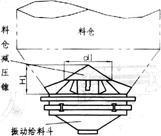 慣性振動(dòng)給料斗在設(shè)計(jì)計(jì)算中已考慮了一定的倉(cāng)壓,但建議在料倉(cāng)內(nèi)物料高度大于2m時(shí),在料倉(cāng)內(nèi)安裝料倉(cāng)減壓錐,以確保振動(dòng)給料斗更穩(wěn)定地工作,特別是確保其給料精度更趨準(zhǔn)確。料倉(cāng)減壓錐應(yīng)焊接在料倉(cāng)內(nèi),并保持平穩(wěn)。料倉(cāng)減壓錐安裝圖,安裝尺寸如下: